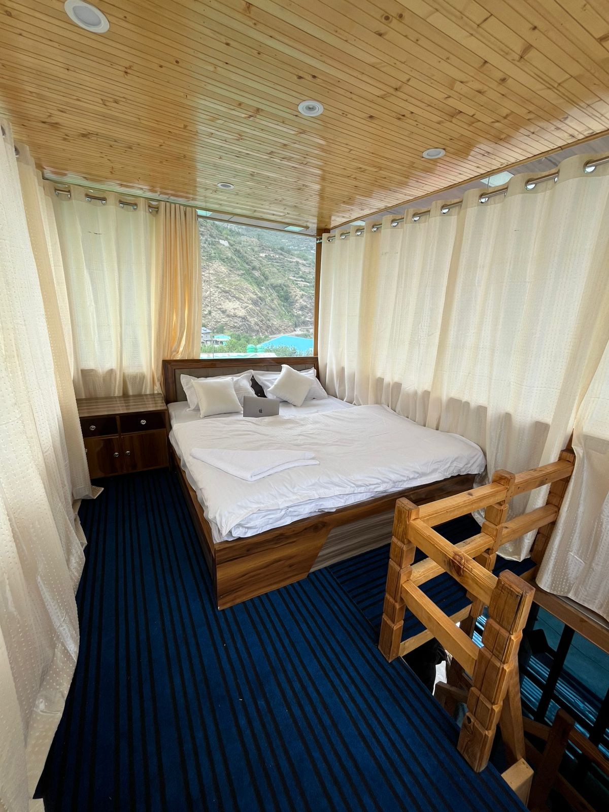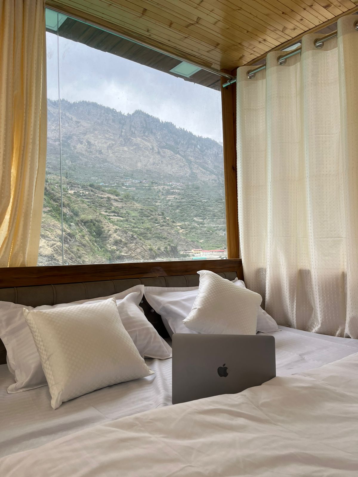 Step into a room where nature surrounds you from every angle. With large glass windows and an open design, enjoy uninterrupted 360° views of the serene valley, majestic hills, and changing skies—right from the comfort of your bed.